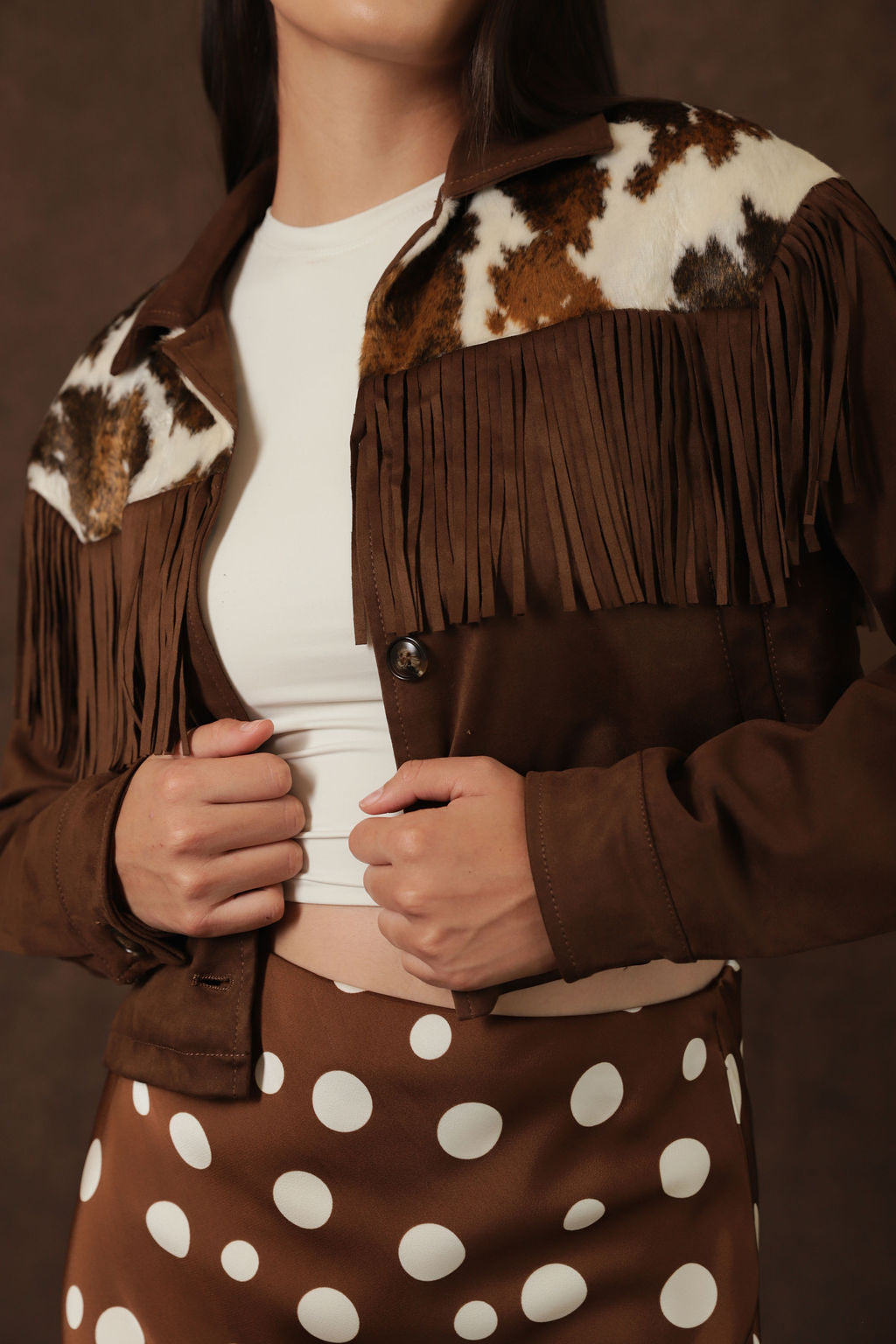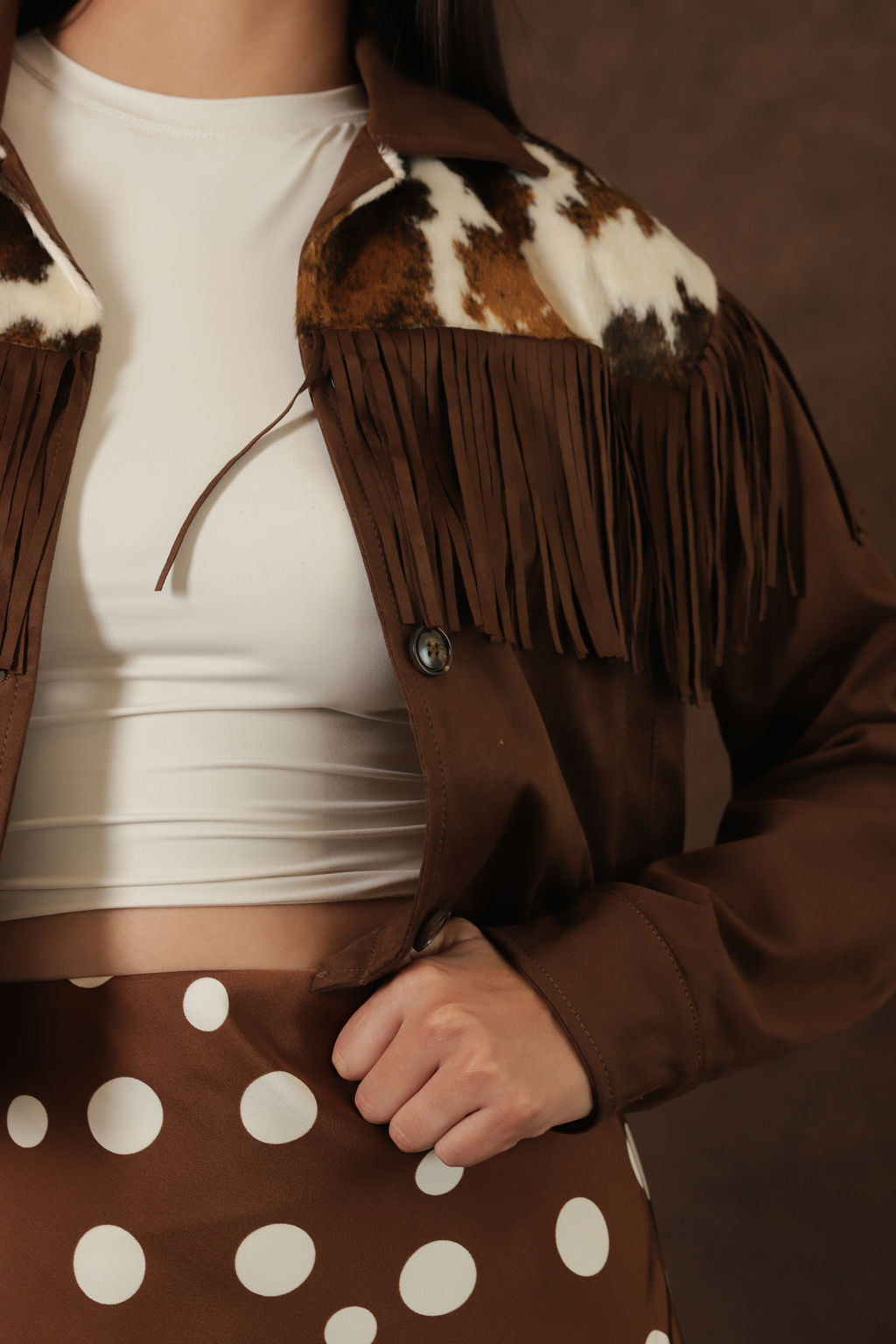 Chaqueta Western de Mujer Café – Flecos y Parches Peludos Estampados