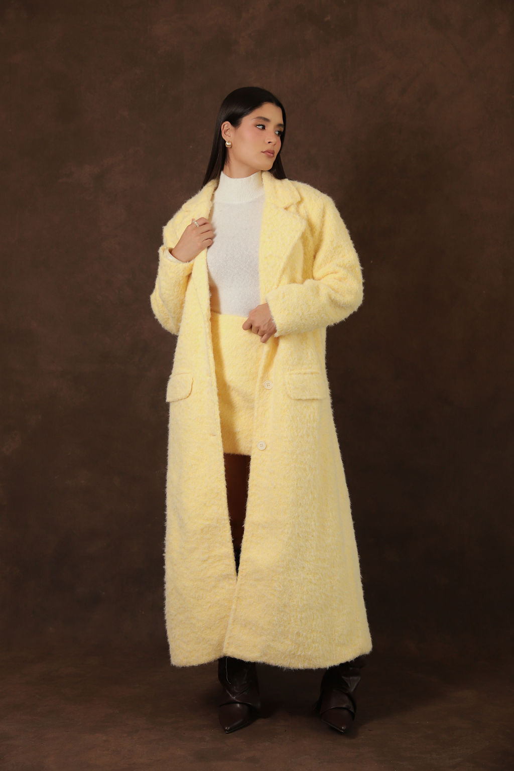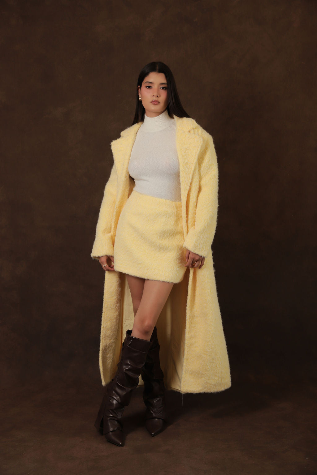 Set Amarillo Pastel Plush – Abrigo Oversized y Falda Mini de Peluche Suave